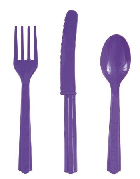 Purple cutlery set. Reusable. Consists of 6 knives, 6 forks and 6 spoons.