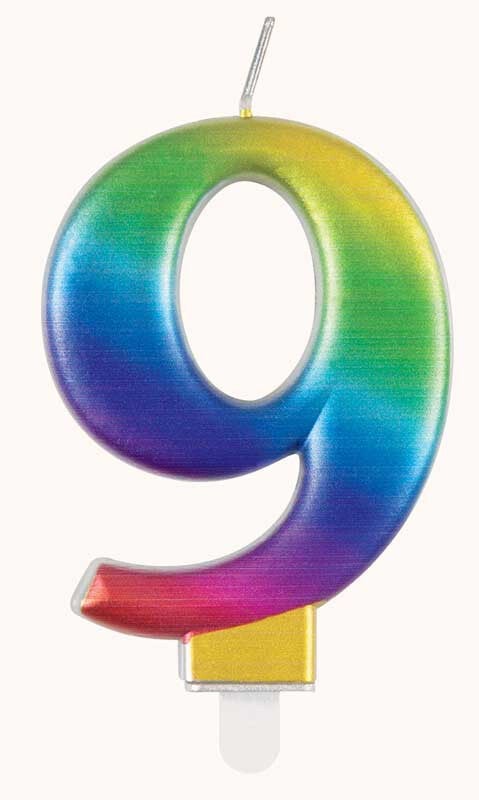 Rainbow number 9 candle. Approx 6cm.