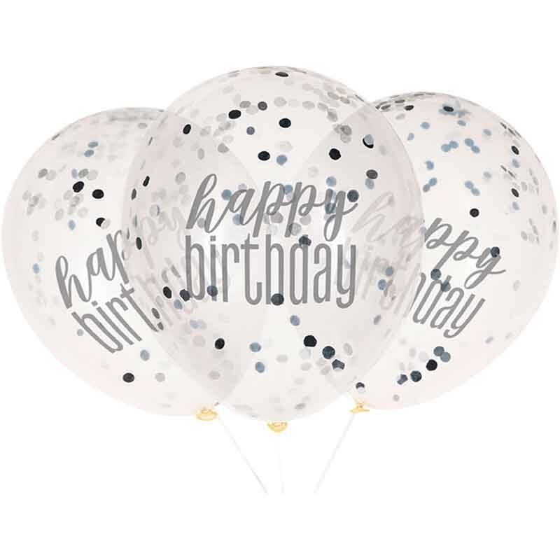 Happy birthday black confetti balloons.